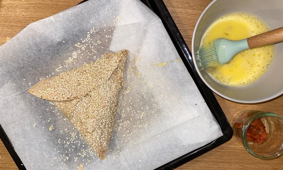 - מברישים את הסמבוסק טורטייה בביצה טרופה ומפזרים שומשום.